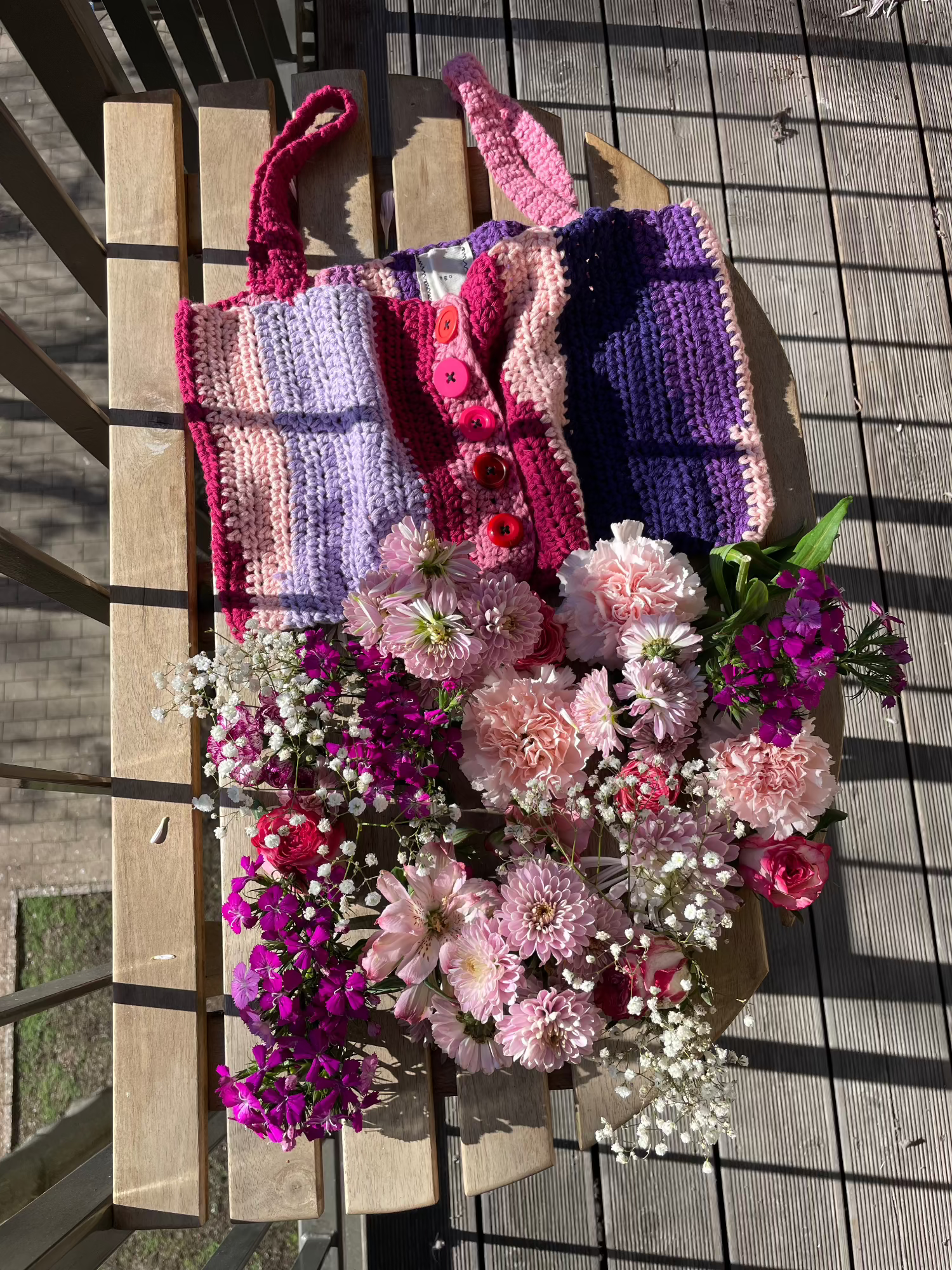 this playful crochet tank top is perfect for a summer festival or a night out with friends. handcrafted with soft, 100% cotton yarn, it features a vibrant color block design in shades of pink, purple, and red. the button-up front adds a touch of vintage charm, while the adjustable straps ensure a comfortable fit. pair it with your favorite high-waisted jeans or a mini skirt for a fun and flirty look. this ethically made tank top is sure to make you stand out from the crowd.