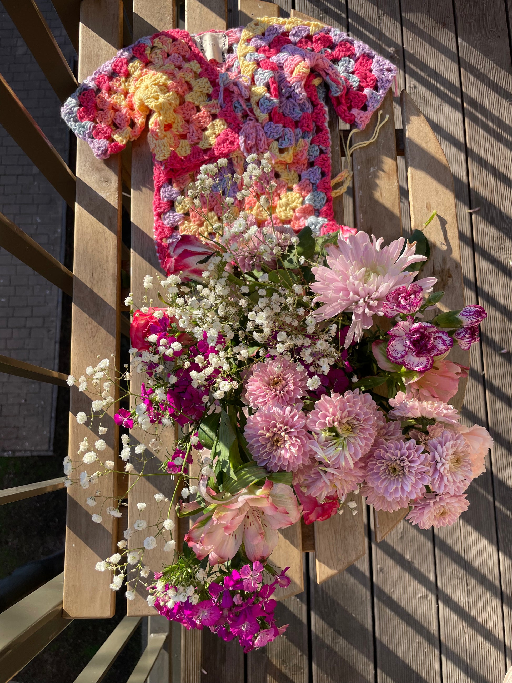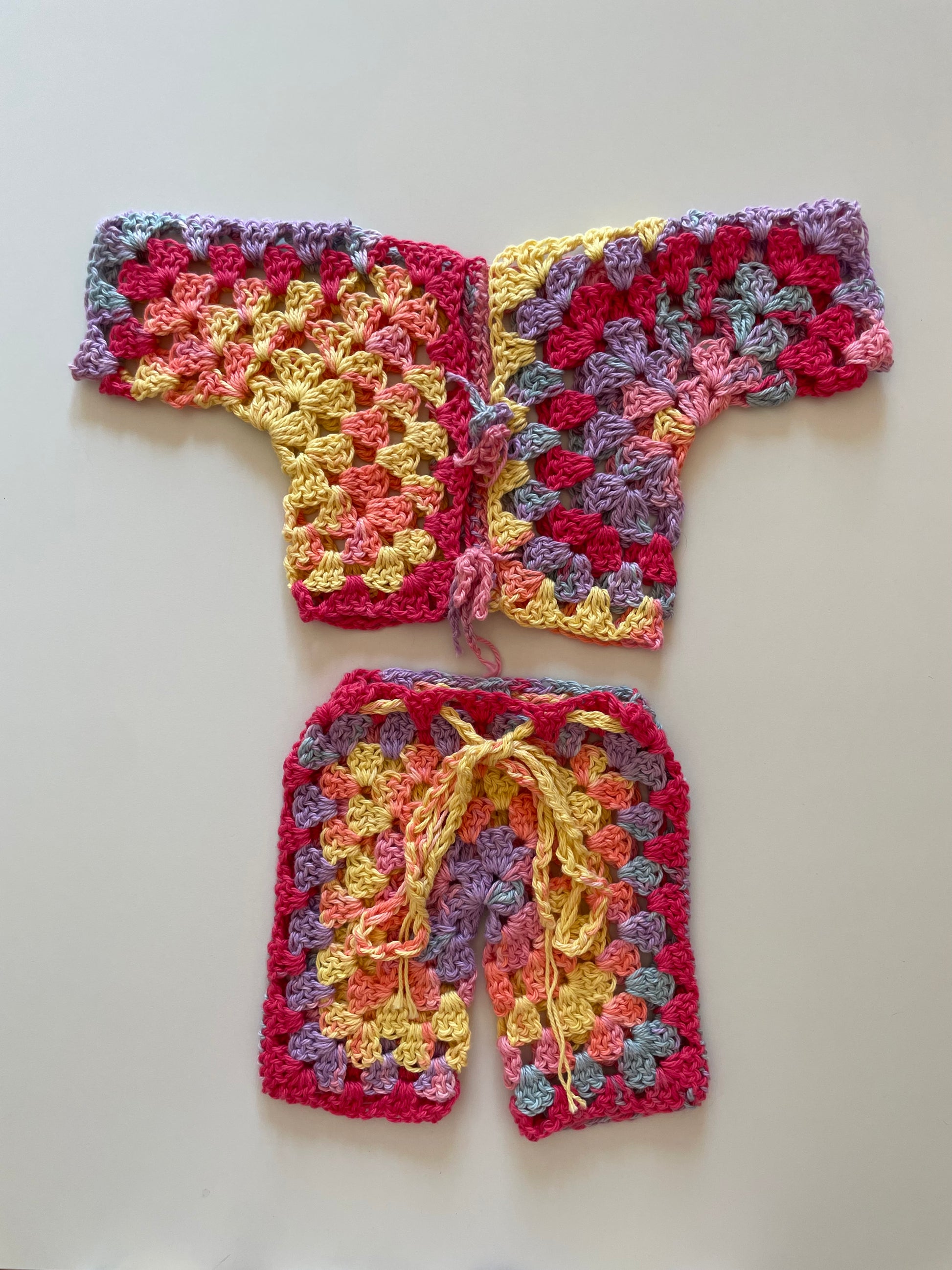 this colorful handmade crochet set is ideal for your infant. with a vibrant color palette of pink, yellow, purple, and blue, it is certain to add a playful and captivating touch to their attire. included are a jacket and pants crafted from premium-quality, soft cotton yarn. the drawstring closures allow for effortless dressing and undressing. this set is guaranteed to bring happiness and comfort to your little one.