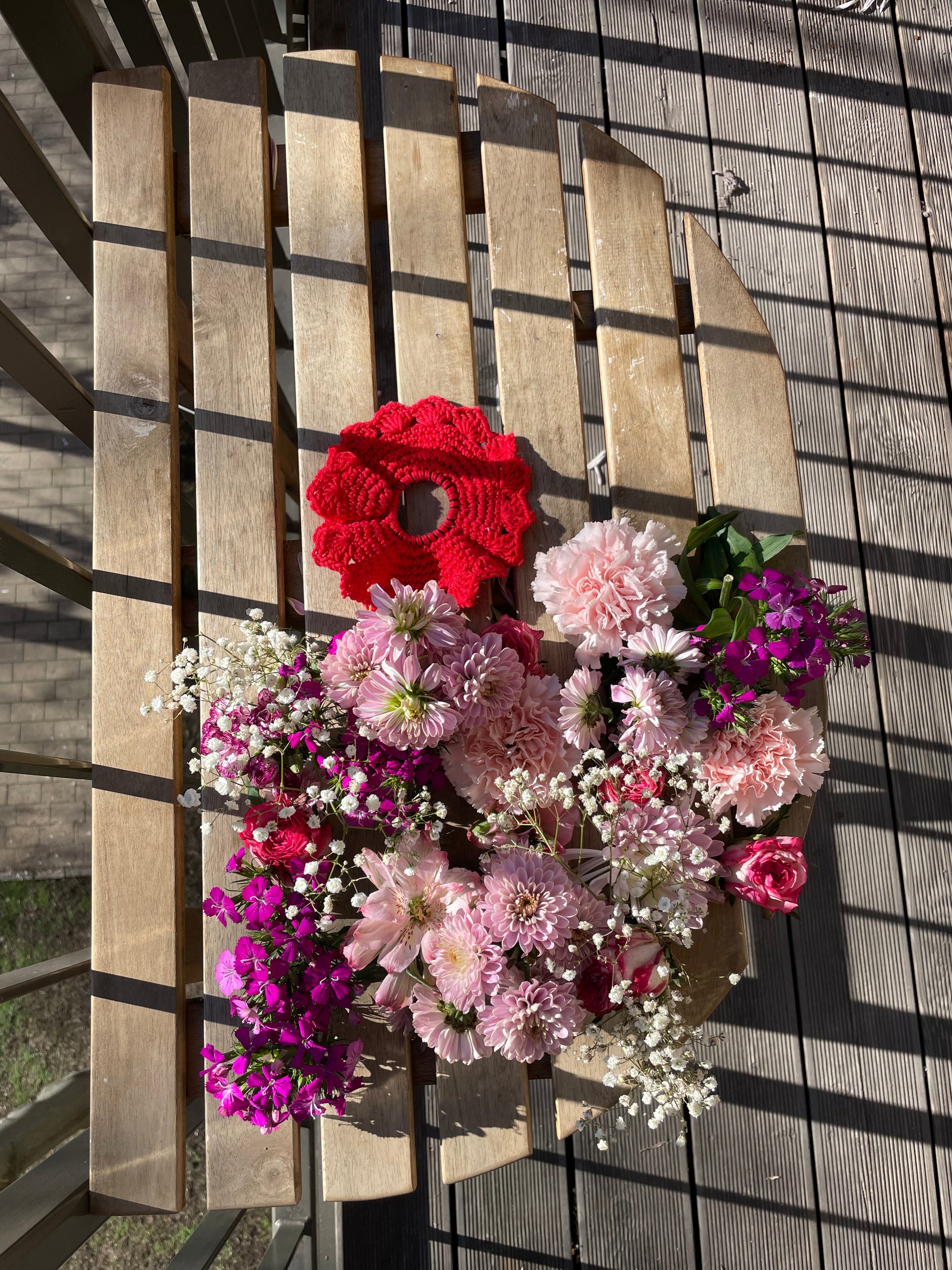 this vibrant red crochet hair scrunchie is a must-have accessory. handcrafted with soft, 100% cotton yarn, it features a beautiful floral design that adds a touch of bohemian flair to any hairstyle. the elastic band ensures a comfortable fit, while the vibrant color adds a pop of personality. this ethically made scrunchie is perfect for keeping your hair in place or simply as a stylish accessory.
