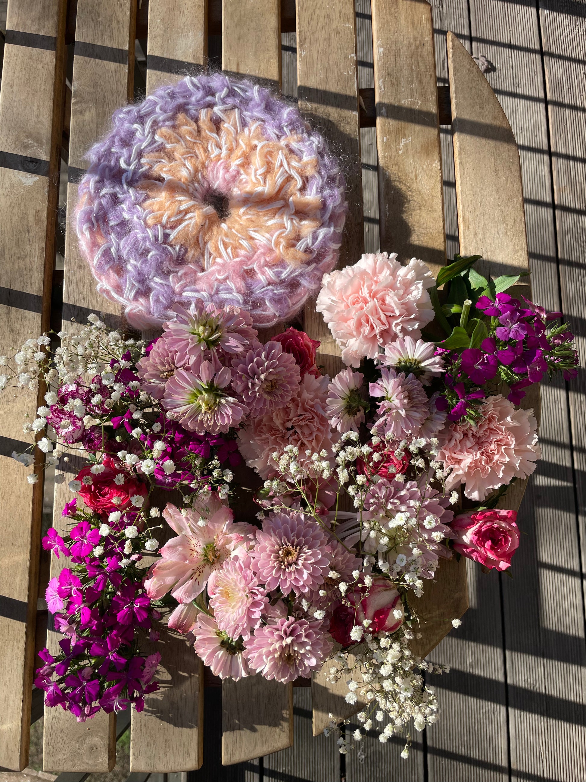 this artisanal mohair and cotton scrunchie features a soft and cozy blend of yarns in a lovely pink, purple, and beige gradient. Its crocheted texture adds a touch of boho-chic style, while the gentle elastic band keeps your hair in place without causing damage. perfect for adding a whimsical touch to any outfit, whether you're dressing up or keeping it casual, this scrunchie also makes a thoughtful gift for the fashion-forward individual who appreciates unique and handmade accessories.
